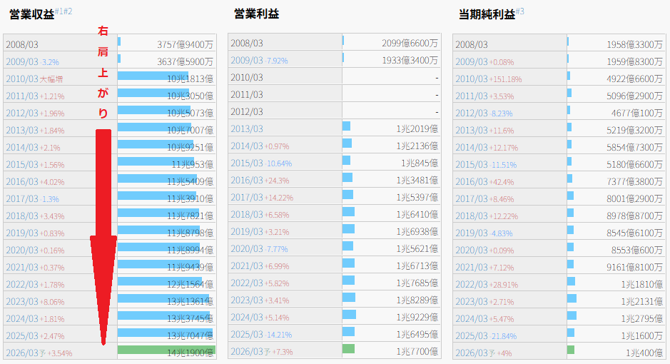 NTTの場合、売上・利益ともに安定しており、長期保有に安心感があります。