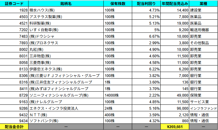 現在の年間配当金は約270,000円。(月平均22,500円)